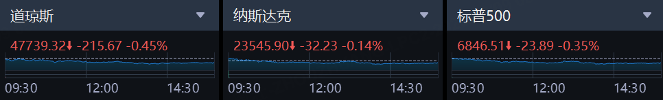 美东时间周一,美股三大股指集体收跌,投资者在等待本周稍晚举行的美联储年内最后一次货币政策会议。截至收盘,指跌215.67点,跌幅为0.45%,报47739.32点;纳指跌32.22点,跌幅为0.14%,报23545.90点;标普500指数跌23.89点,跌幅为0.35%,报6846.51点。
