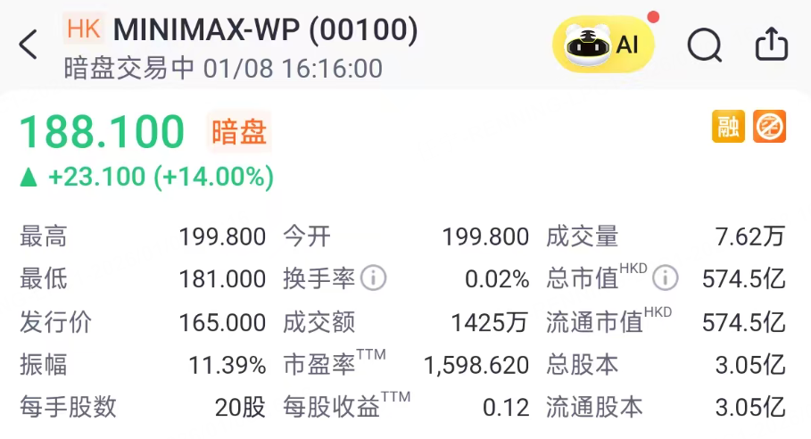 1月8日周四, MINIMAX-WP 开启暗盘,截至发稿大涨14%,不计手续费,每手赚超460港元。MiniMax被称为“全球最年轻AI团队”,专注全模态大模型研发,获众多国际顶级长线基金支持。