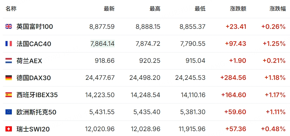 欧洲主要股指全线上涨,截至发稿,英国富时100涨0.26%,法国CAC40涨1.25%,德国DAX30指数涨1.18%。