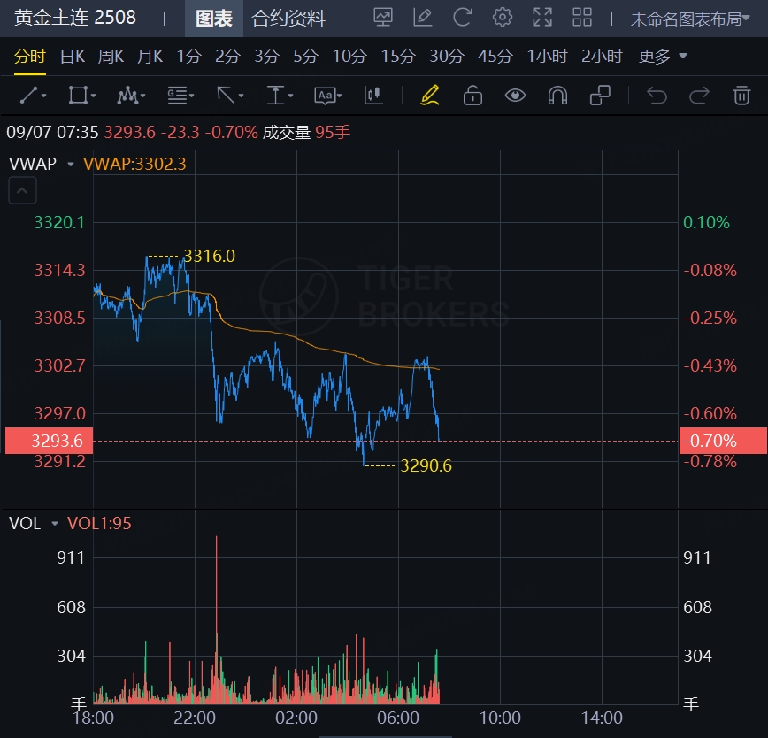 黄金期货日内走低,截止发稿,跌0.7%,报3293.6美元/盎司。