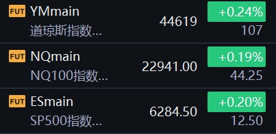 7月9日,美股三大股指期货齐涨,截止发稿,道指期货涨0.24%,纳指期货涨0.19%,标普500指数期货涨0.2%。