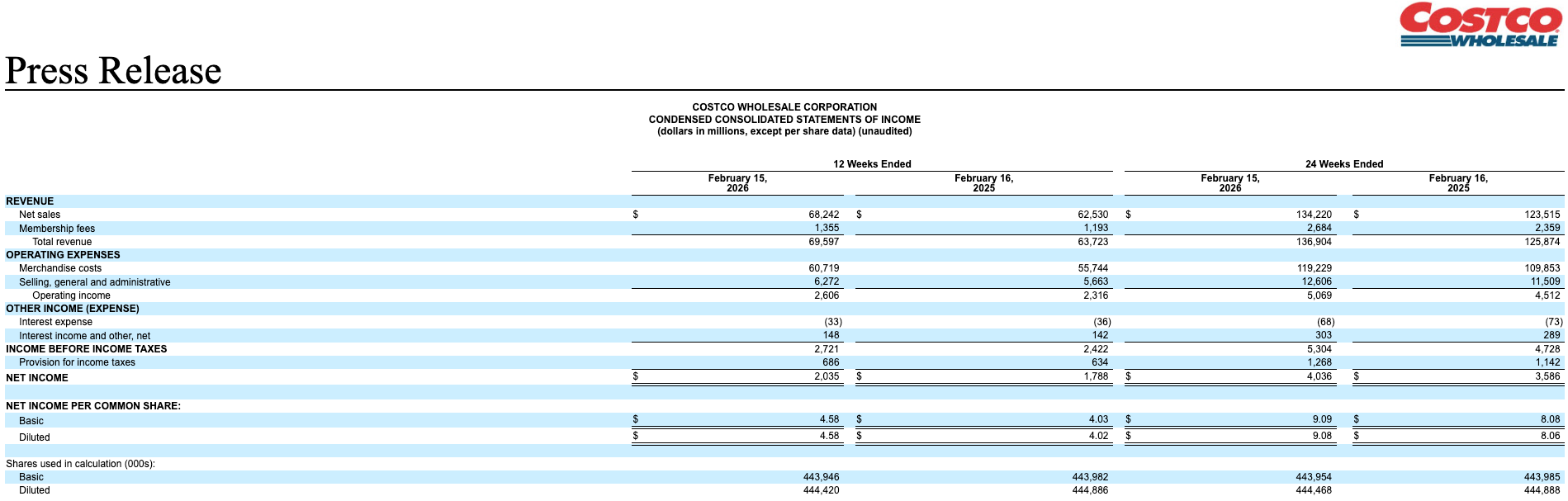 美股周四盘后, 好市多 公布了2026财年第二季度及最新销售数据。公司表示,在截至2026年2月15日的第二财季以及2026财年前24周期间,整体销售和利润均实现稳健增长。