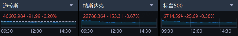 美东时间周二,美股三大指数集体收跌,截至收盘,标普500指数跌0.38%,报6714.59点,七日连涨就此终结;纳斯达克综合指数跌0.67%,报22788.36点;道琼斯工业平均指数跌0.2%,报46602.98点。