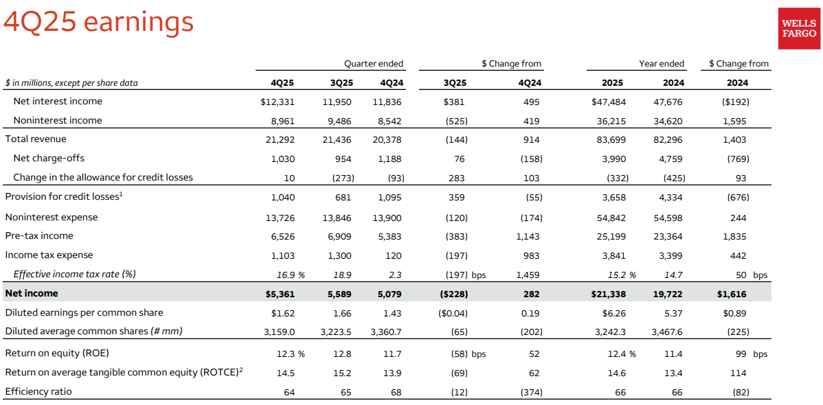 1月14日周三,富国银行公布了2025年第四季度财务业绩。数据显示,Q4营收为212.9亿美元,同比增长4%,略低于华尔街预期的216亿美元。Q4非GAAP每股收益为1.76美元,高于市场预期的1.69美元。富国银行2025年净利润达到213亿美元,而分析师此前预计为 216 亿美元。