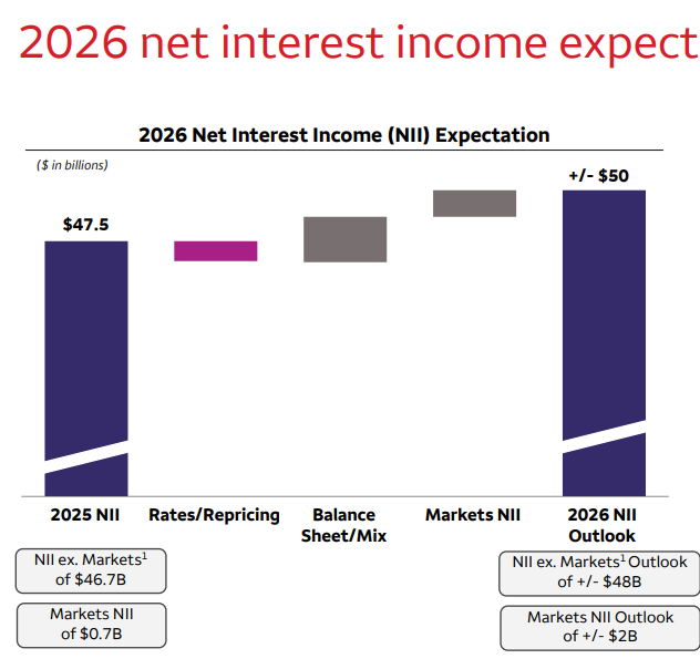 该季度净利息收入(NII)为123.3亿美元,同比增长4%,低于分析师预测的124亿美元,这是贷款业务的主要利润来源。这使得全年净利息收入达到475亿美元,接近其此前预测的2025年净利息收入与2024年基本持平。Q4非利息收入为 89.6 亿美元,同比增长5%。