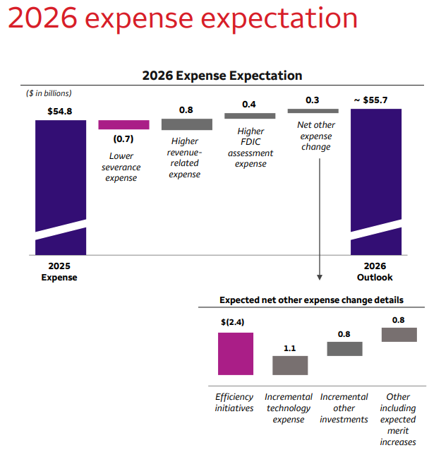 展望未来,富国银行预计2026年净利息收入约为500亿美元,而市场预期为502亿美元。分析师一直预测,随着借款人逐渐学会更好地应对特朗普政府政策带来的不确定性,贷款业务将会反弹。该银行预计2026年的支出约为 557 亿美元,而分析师的预期为 559 亿美元。