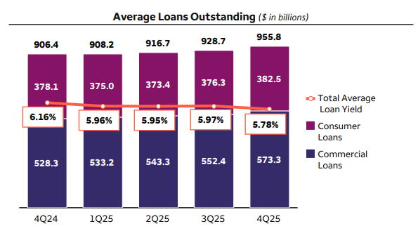 2025年第四季度平均贷款额为 9558 亿美元,高于第三季度的 9287 亿美元。平均存款额从上一季度的 1.34 万亿美元增至 1.38 万亿美元。