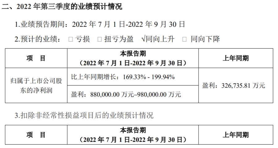 10月10日,宁德时代公告,预计前三季度净利润165亿元-180亿元,同比增长112.87%-132.22%;预计第三季度净利润88亿元–98亿元,同比增长169.33%-199.94%。