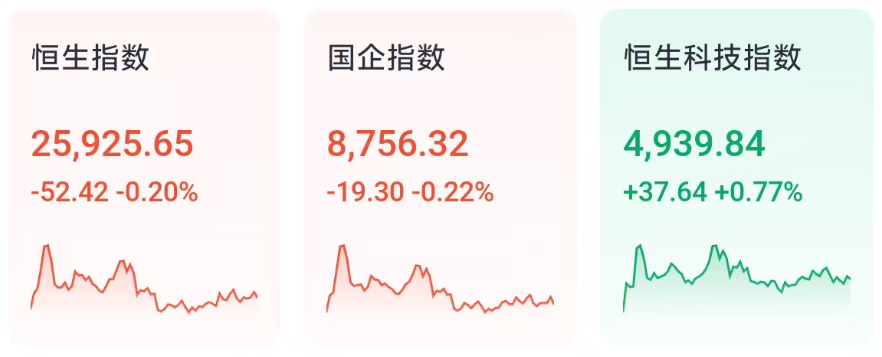 周一(4月27日),港股主要指数表现分化:恒生指数收报25,925.65点,跌0.20%;国企指数收报8,756.32点,跌0.22%;走势最强的恒生科技指数收报4,939.84点,涨0.77%。全日大市成交额约2,516.34亿港元,较上周五小幅放量,显示场内资金情绪活跃。北水净流继续偏好科技与半导体板块,主题轮动明显加快。