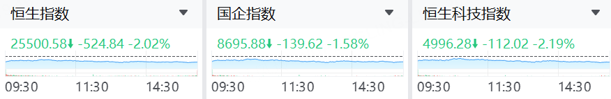 今日港股全线回落,主要受科技权重走弱与资源品分化影响。收盘时,恒生指数报25500.58点,跌2.02%;国企指数报8695.88点,跌1.58%;恒生科技指数报4996.28点,跌2.19%。盘中科技平台及半导体普遍承压,而油气、煤炭抗跌拉升对冲部分跌势。
