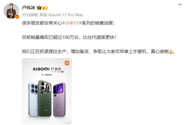 小米集团总裁卢伟冰发文称:“很多朋友都非常关心小米17系列的销售进展:目前销量确实已超过100万台,比往代速度更快!我们正在抓紧提拉生产,增加备货,争取让大家尽早拿上手爱机,真心感谢。”