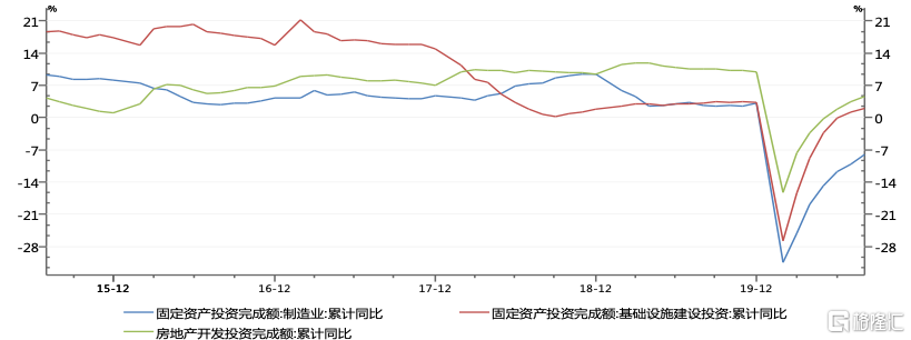 但是今年疫情以后,经济结构出现了较大的变化,在内需和外需的比较中,表现为外需强、内需弱;在内需之间的不平衡性表现为投资强、消费弱;而在投资的几大板块中表现为基建投资和房地产投资强、制造业投资弱,并且这种变化趋势可能在未来几个月里还会继续存在。