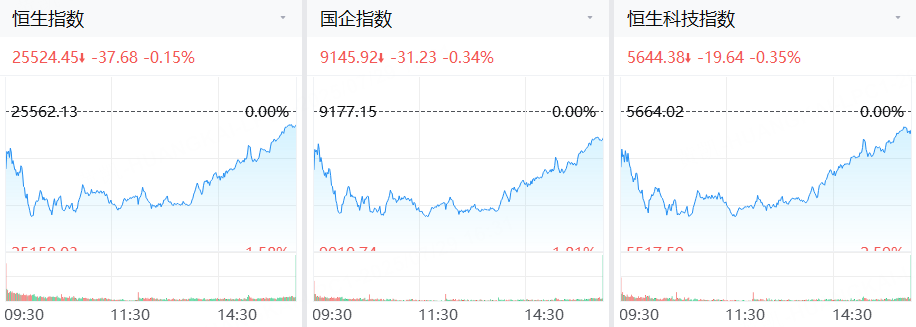 港股三大指数齐跌, 恒生指数跌0.15%, 恒生科技指数跌0.35%, 国企指数跌0.34%。