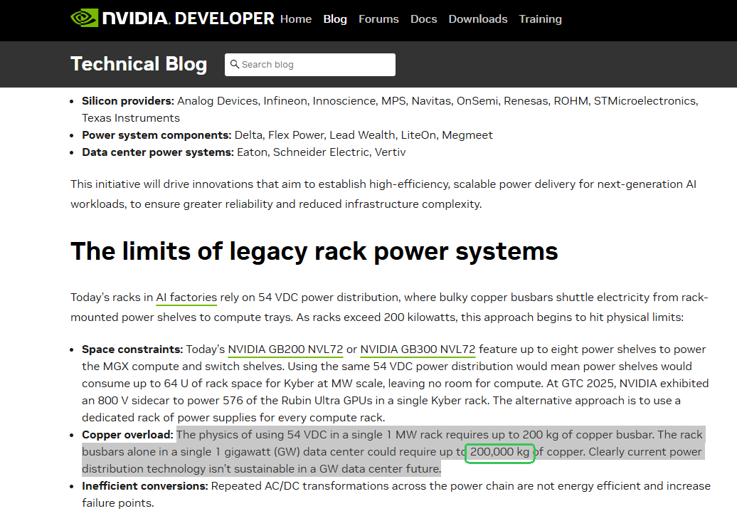 1月16日,针对外界的质疑,英伟达已将其一篇技术论文中有关数据中心铜需求量数据进行了改正,将传统数据中心一吉瓦机架的铜母线用量修正为200吨,仅为原论文表述“50万吨”的0.04%。这也意味着数据中心铜需求预期需要被大幅调低。