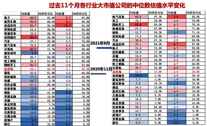 以下是在过去11个月A股各板块的估值对比,发现电气设备(与新能源、双碳经济相关)的估值水平大幅提升,而化工行业的火爆主要靠化工品涨价,PE水平反而下降了,除了化工,钢铁和有色也是如此。去年比较热门的家用电器的PE水平又从处于历史的80分位,下跌到了35分位;更惨的医药生物板块,PE水平从去年11月的80分位下跌到14分位;食品饮料板块的PE也从去年11月的90分位下跌至目前的68分位。