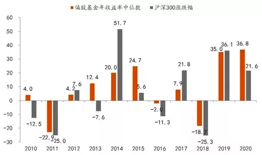 从历史上看,公募偏股型基金连续两年收益率超过30%比较罕见,上一次还是2006-07年间,公募基金收益中位数连续两年超过100%,但依然跑输指数。但这一次大盘的走势并不强,很显然,时代的天平正在向机构投资者倾斜。