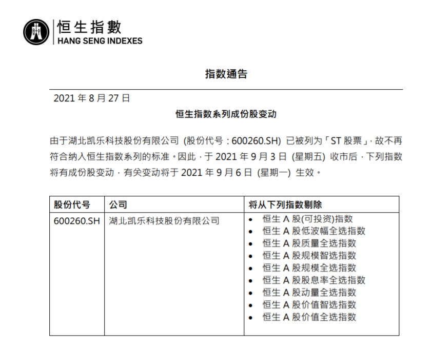 恒生指数公司公告,葛洲坝将从上交所退市。因此,于9月1日收市后,该公司将从一系列指数中剔除,有关变动将于9月2日生效。另外,由于湖北凯乐科技股份有限公司已被列为ST股票,故不再符合纳入恒生指数系列的标准。因此,于9月3日收市后,将从一系列指数中剔除,有关变动将于9月6日生效。