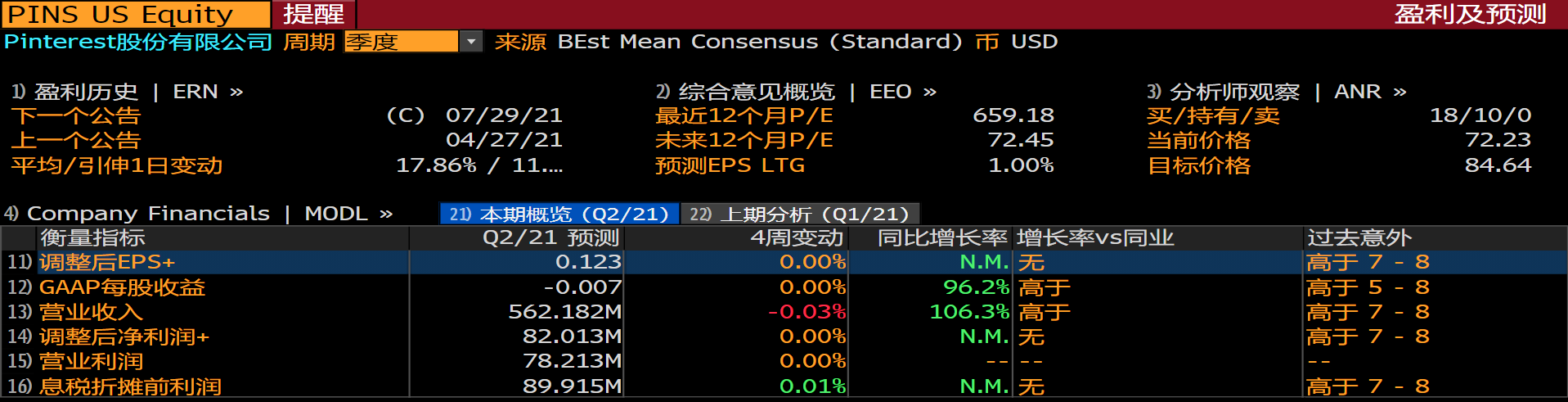 根据彭博一致预期,Pinterest第二季度营收为5.62亿美元,调整后净利润为0.82亿美元,调整后EPS为0.123美元。28位分析师中有18位给出买入评级,10位给出持有评级,平均目标价84.64美元,较当前72.23美元的股价有约17%的上涨空间。