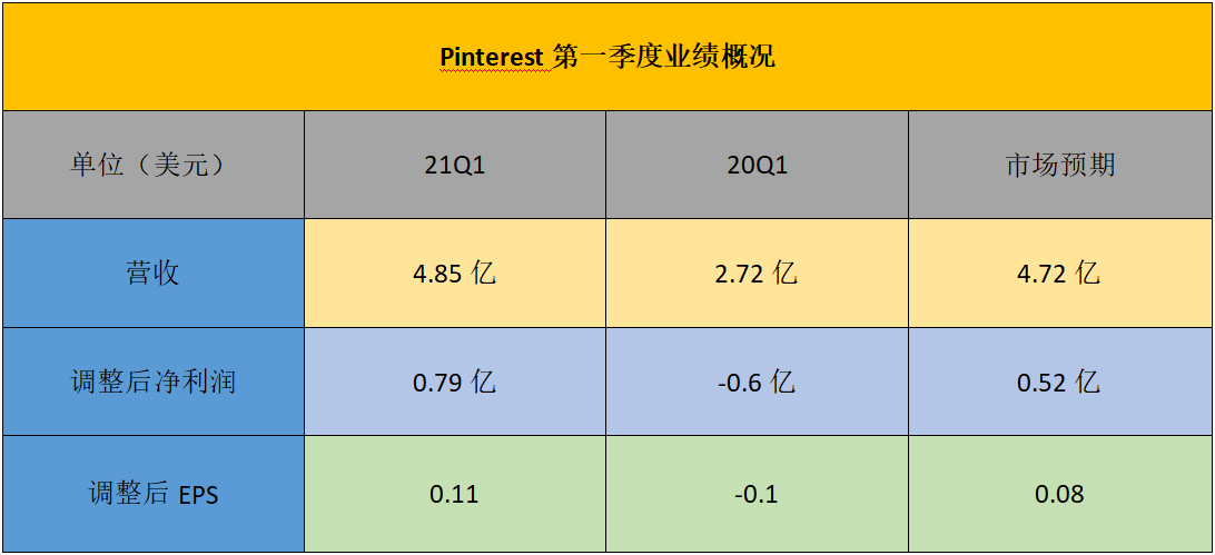 Pinterest第一季度营收和EPS均好于预期,但由于疫情的缓和,其3月后的用户增长有所放缓。财报显示,Pinterest第一季度收入同比增长78%,达到4.85亿美元;GAAP下第一季度净亏损为2167万美元,或每股净亏损$0.03;Non-GAAP净利润7853万美元,或每股收益$0.11;调整后的EBITDA为8382万美元。截止3月底,Pinterest全球月活跃用户(MAUs)同比增长30%,达到4.78亿。