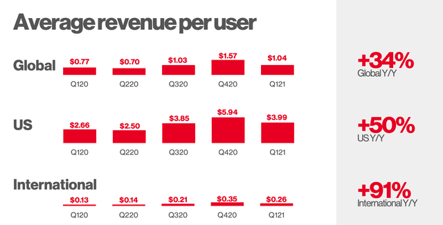 对于第二季度,管理层表示预计“全球MAU将在15%左右增长,而美国MAU的同比百分比将持平。”鉴于公司指导收入同比增长约105%,我们可以推断管理层预计其第二季度收入增长的大部分将来自ARPU的大幅增长。