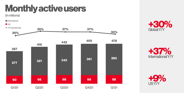 上个季度,该公司的全球 MAU 同比增长30%至4.78亿,其全球ARPU增长34%至1.04美元。