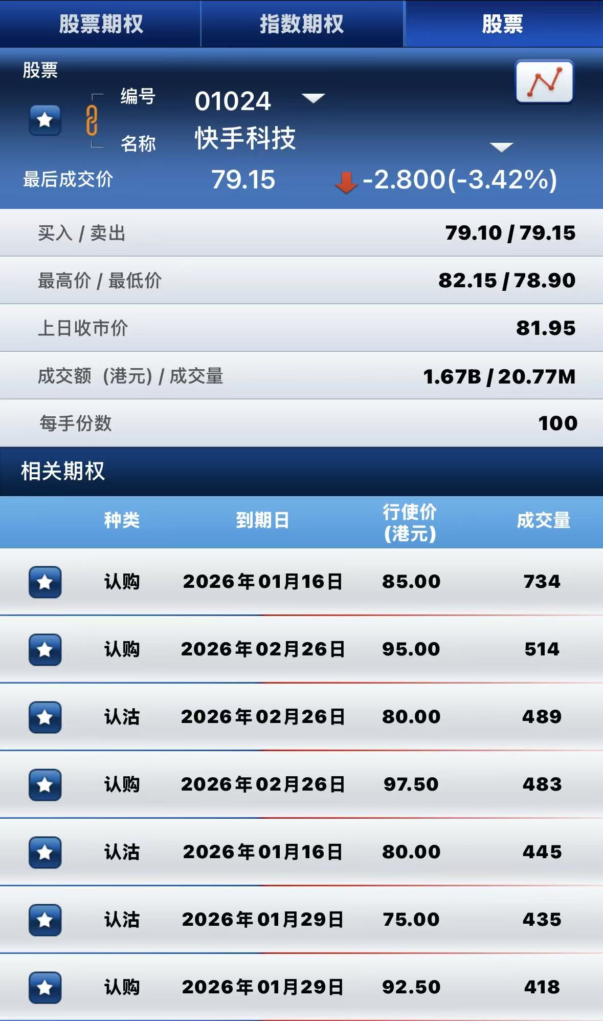 快手-W跌超3%,期权方面:半日成交超1.3万张合约,其中于1月16日到期行权价85港元的认购期权成交量居前,成交超700张合约。 $KST.HK 20260116 85.00 CALL$