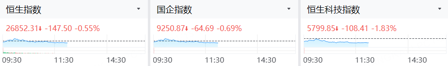 1月15日,港股三大指数齐跌,截止午间收盘,恒生指数跌0.55%,恒生科技指数跌1.83%,国企指数跌0.69%。