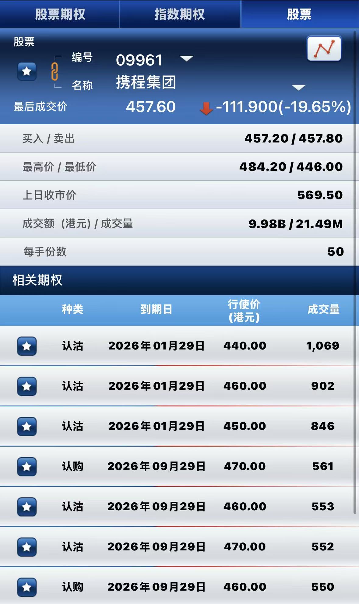 受市场监管总局依法对其进行立案调查影响, 携程集团-S跌近20%,期权方面:半日成交超2万张合约,其中于1月29日到期行权价440港元的认沽期权成交量居前,成交超1000张合约。 $TRP.HK 20260129 440.00 PUT$