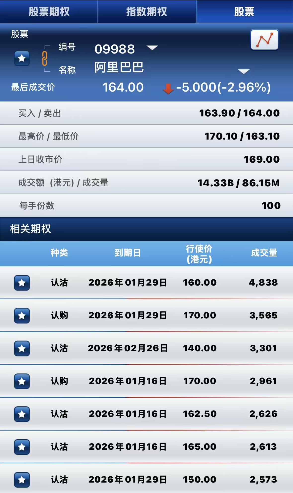 阿里巴巴-W跌近3%,期权方面:半日成交超8.8万张合约,其中于1月29日到期行权价160港元的认沽期权成交量居前,成交超4800张合约。 $ALB.HK 20260129 165.00 PUT$