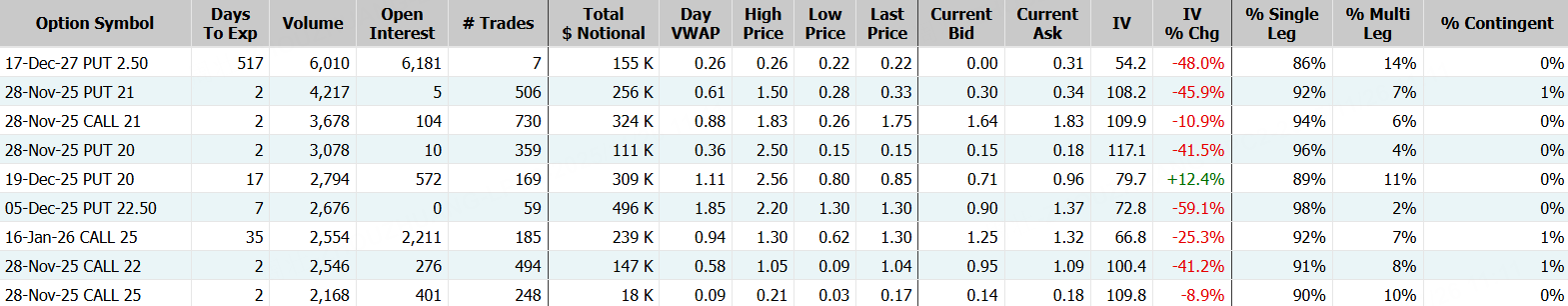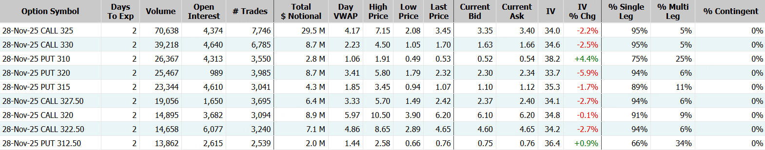 期权方面,英伟达成交485.66万张,环比前一交易日增加逾65%,看涨期权占比降至61.9%,其中于11月28日到期的180美元行使价的看涨期权成交居前,成交逾25万张;谷歌成交75.09万张,环比前一交易日增加逾22%,看涨期权占比升至63.5%,其中于11月28日到期的325美元行使价的看涨期权成交居前,成交逾7万张。 $NVDA 20251128 180.0 CALL$ $GOOG 20251128 325.0 CALL$