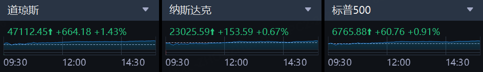 周二,美股三大指数盘中持续走强,收盘时悉数上涨。截至收盘,纳斯达克综合指数涨0.67%,报23025.59点,早盘一度跌超1.2%;道琼斯指数涨1.43%,报47112.45点;标普500指数涨0.91%,报6765.88点。