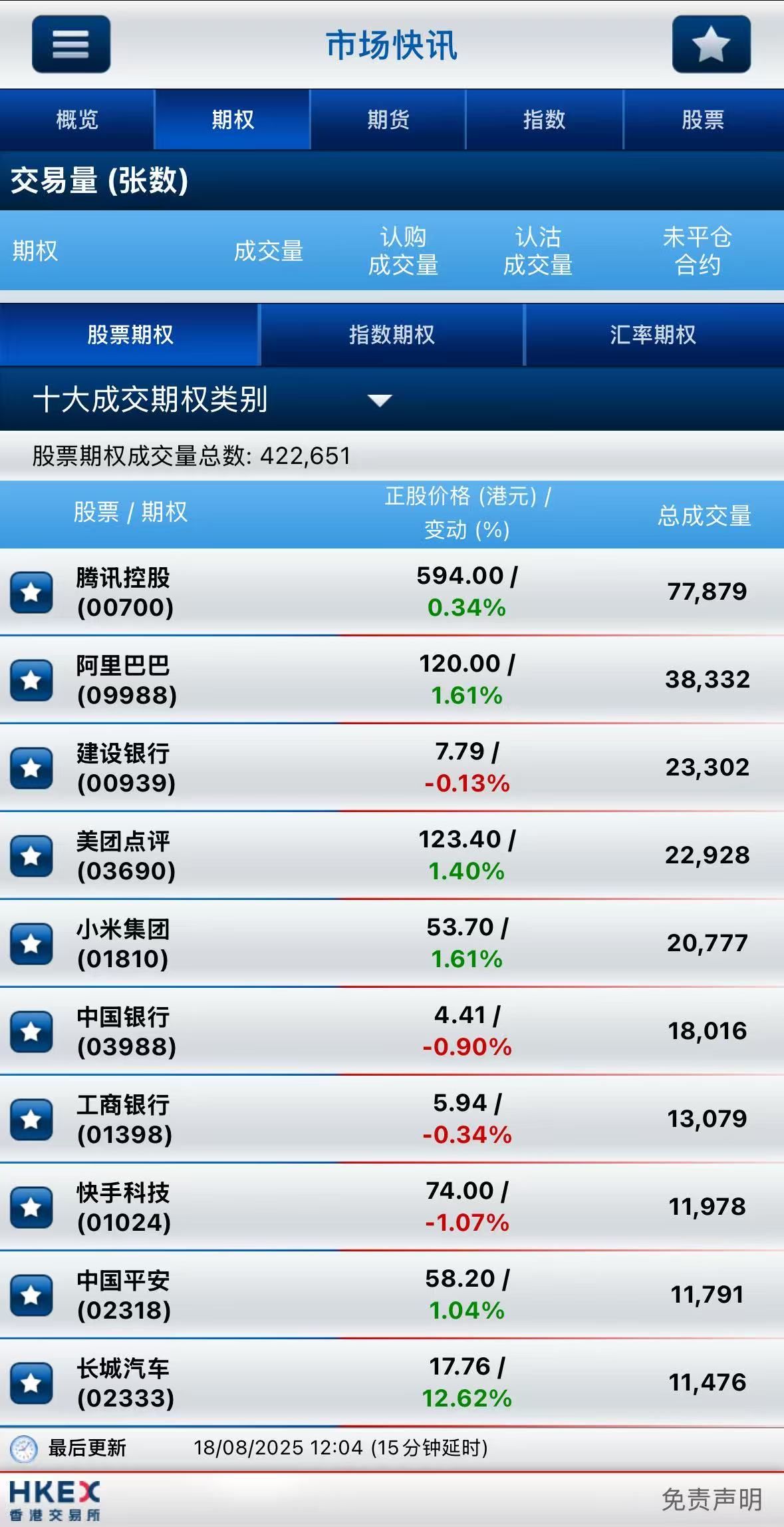 截止午间收盘,港股期权半日成交超42万张,较前一交易日有所下降;其中, 腾讯控股成交量居前,期权成交7.78万张,环比前一个交易日增加近16%;阿里巴巴-W名列次席,期权成交3.83万张;建设银行位居第三,期权成交2.3万张。