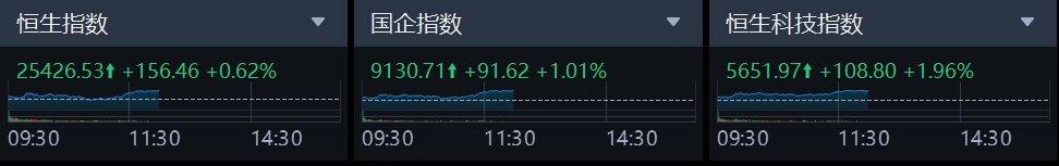 8月18日,港股上午盘三大指数集体上涨,临近午盘现快速拉升行情。恒生科技指数一马当先,午间收涨1.96%,恒生指数、国企指数分别上涨0.62%及1.01%。