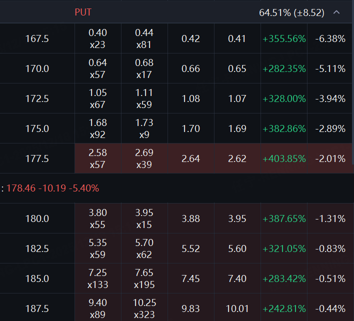 随着股价走低,甲骨文的认沽合约成交价格暴涨,一张177.5美元行权价的PUT,价格涨幅超400%。