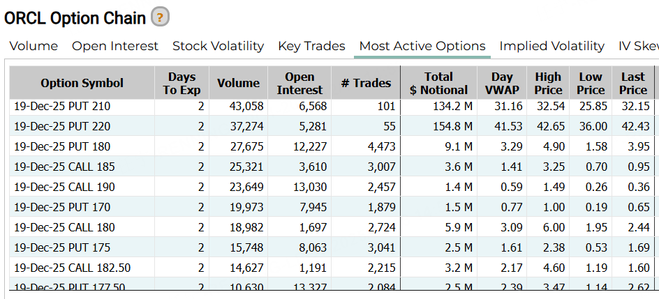 期权方面,甲骨文昨日成交量排名前三位的都是PUT。一份本周五到期的认购合约行权价为190美元。