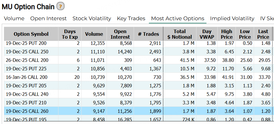 期权方面,美光排名前十的合约中,一张本周五到期的CALL,行权价达260美元,较现价有约15%的涨幅空间。