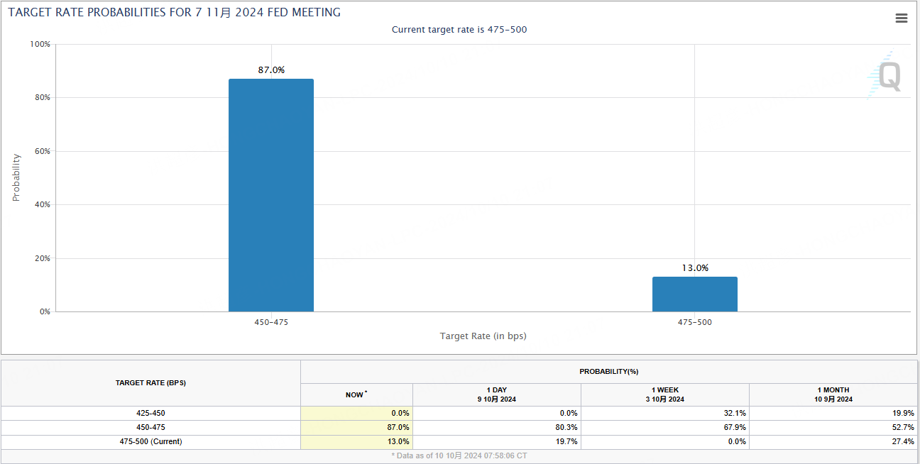 数据公布后,交易员增加了对11月份美联储降息25个基点的押注,目前已经达到了87%,交易者预计美联储未来还将进一步降息,已完全退出美联储11月将暂停降息的押注。