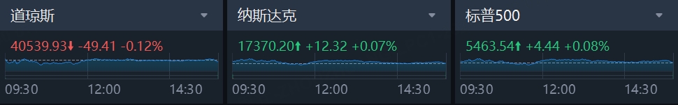 美东时间周一,三大指数涨跌不一,道指小幅下跌,标普500指数微涨,纳指盘中一度涨1%,并一度转跌,但最终录得微涨。截至收盘,道琼斯指数跌0.12%,报40539.93点;标普500指数涨0.08%,报5463.54点;纳斯达克指数涨0.07%,报17370.2点。