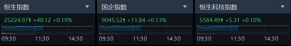 8月19日,港股上午盘三大指数震荡收涨,总体波动不大。截止午盘,恒生指数、国企指数分别上涨0.19%及0.13%,恒生科技指数涨0.1%。