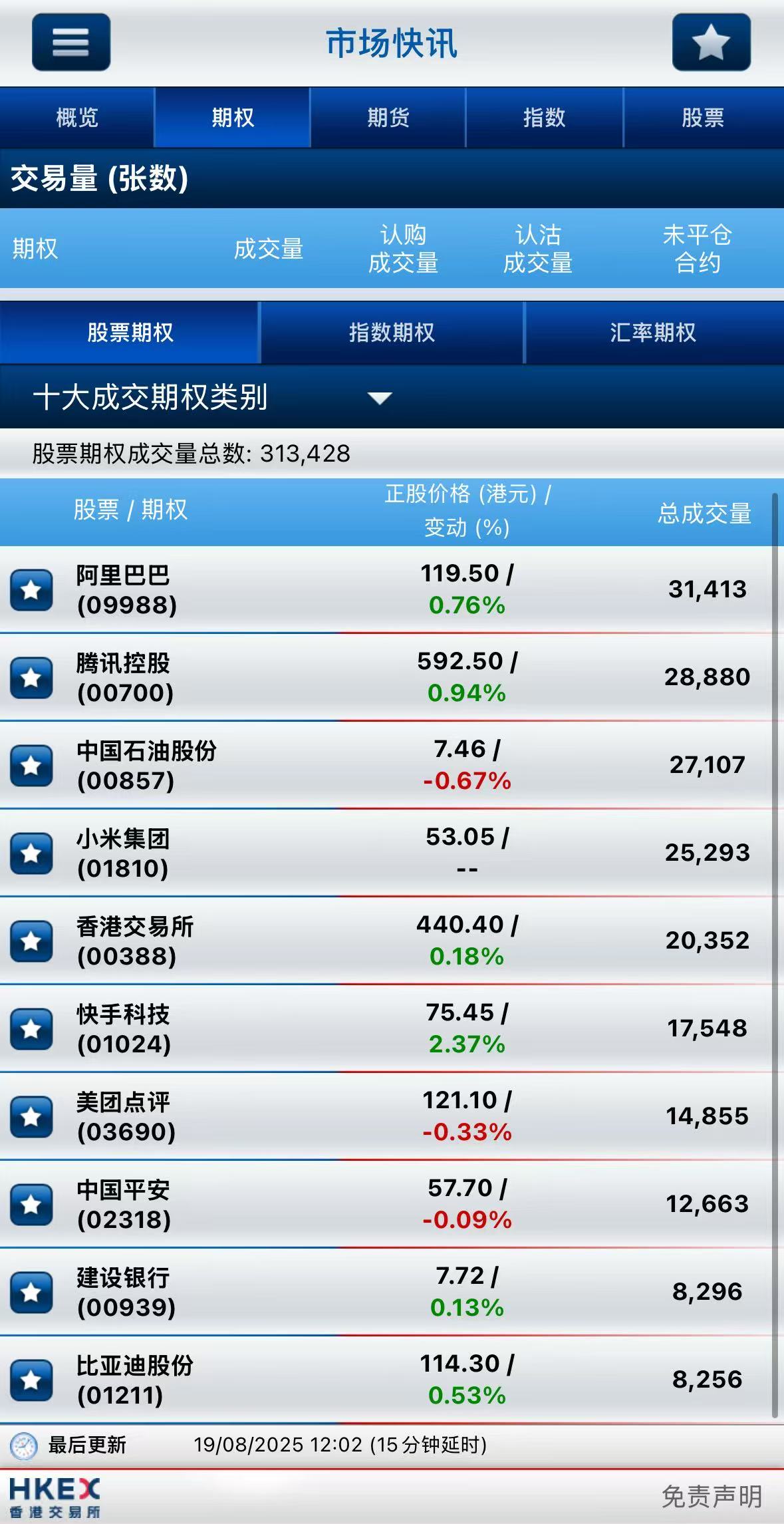 截止午间收盘,港股期权半日成交超31万张,较前一交易日有所下降;其中,阿里巴巴-W期权成交量居首,成交超3.14万张;腾讯控股名列次席,成交近2.89万张;中国石油股份位居第三,成交超2.7万张。