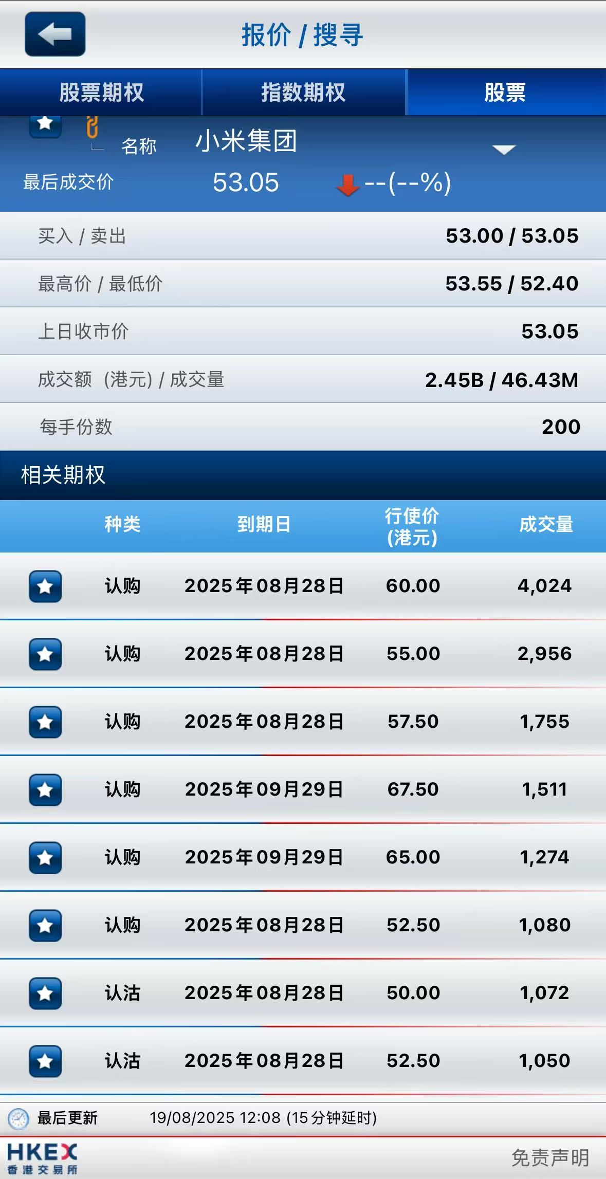 小米集团-W期权成交超2.5万张,认购期权成交活跃,其中,8月28日到期60港元行使价的认购期权成交超4000张。