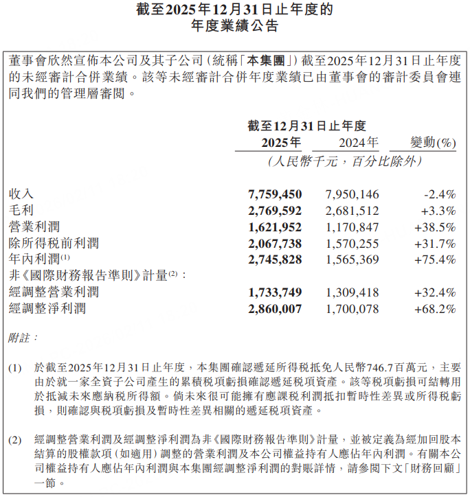 2月11日,网易云音乐2025年实现营收77.6亿元人民币,同比下降2.4%;毛利27.7亿元,同比增长3.3%;营业利润16.2亿元,同比增长38.5%。经调整净利润28.6亿元,同比大幅增长68.2%。会员订阅收入同比增长13.3%,毛利率由33.7%提升至35.7%。