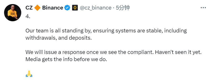 币安CEO赵长鹏发推文表示,团队将确保各系统稳定,包括提款和存款。他还称,一旦我们看到诉状,我们将向SEC发出回应。