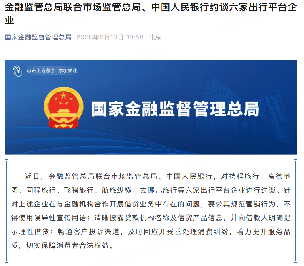 近日,金融监管总局联合市场监管总局、中国人民银行,对携程旅行、高德地图、同程旅行、飞猪旅行、航旅纵横、去哪儿旅行等六家出行平台企业进行约谈。