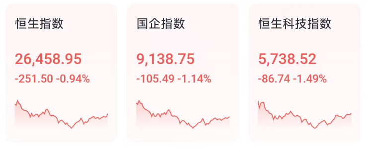 1月7日周三,港股全天弱势震荡,三大指数集体收跌。恒生指数收报26458.95点,跌0.94%;国企指数收报9138.75点,跌1.14%;恒生科技指数收报5738.52点,跌1.49%。