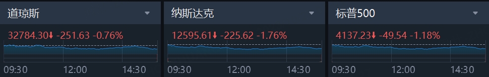 美东时间周四,三大指数集体收跌,大型科技股继续下跌,拖累纳指跌近2%。截至收盘,道琼斯指数跌0.76%,报32,784.30点;标普500指数跌1.18%,报4,137.23点;纳斯达克指数跌1.76%,报12,595.60点。
