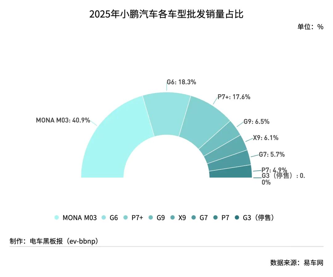 MONA M03是小鹏汽车2025年实现交付量翻倍增长的绝对主力。该车全年批发销量同比增长261.4%至17.6万辆,占公司总交付量的四成以上。MONA M03还取代G6,首次成为小鹏汽车年度最畅销车型。