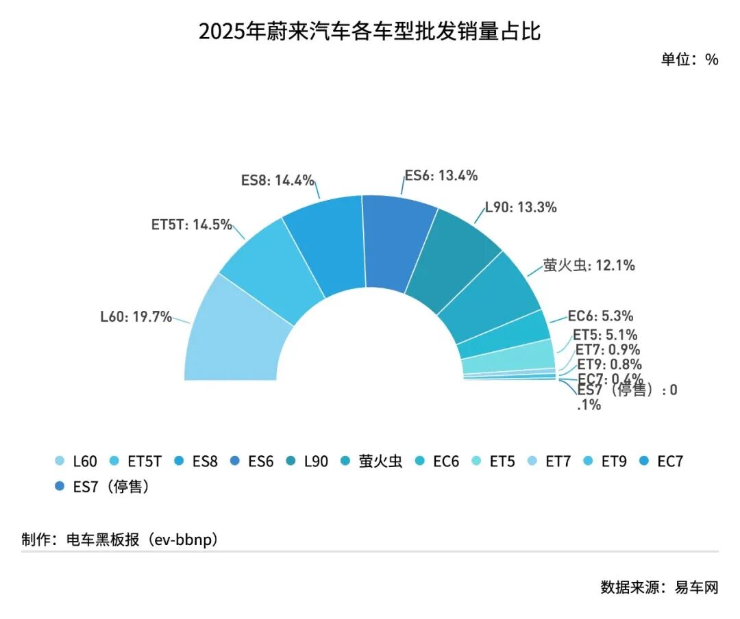 乐道L60全年批发销量超过6.4万辆,是蔚来销量最高的车型,并占公司总交付量的近两成。ET5T、ES8、ES6和乐道L90四款车紧随其后,全年销量均超过4万辆,交付占比亦超过10%。