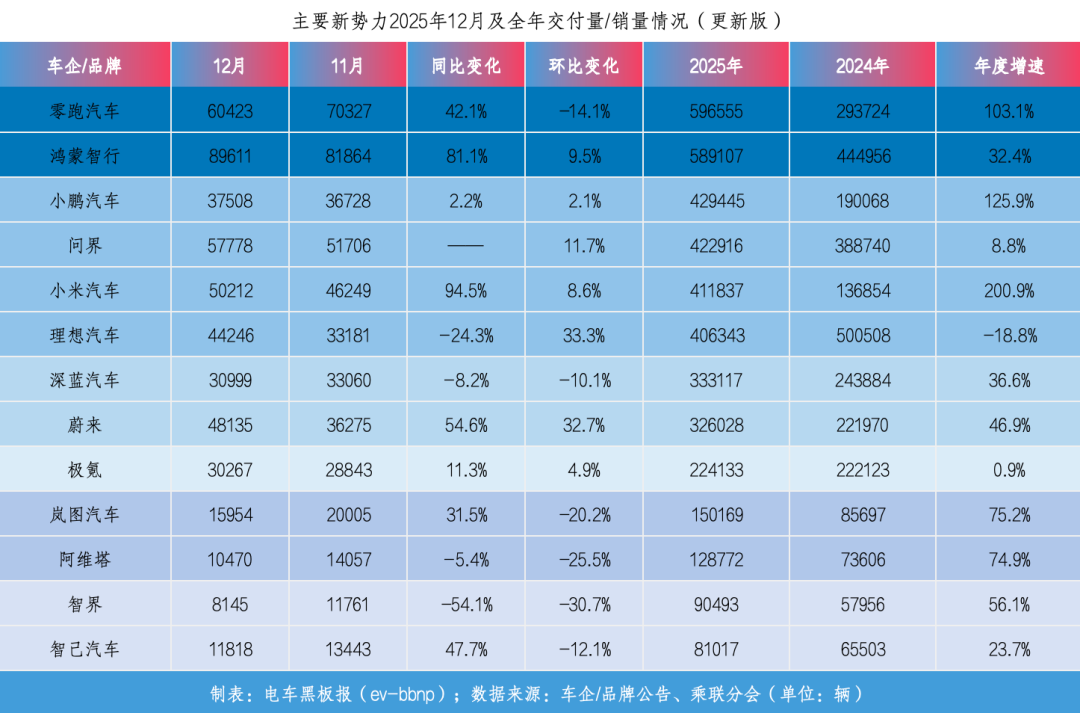 刚刚过去的2025年,无疑是国内造车新势力交付量(销量)集体爆发的一年。在有可比数据的13家主要新势力中,全年交付量实现增长的车企或品牌达到12家。