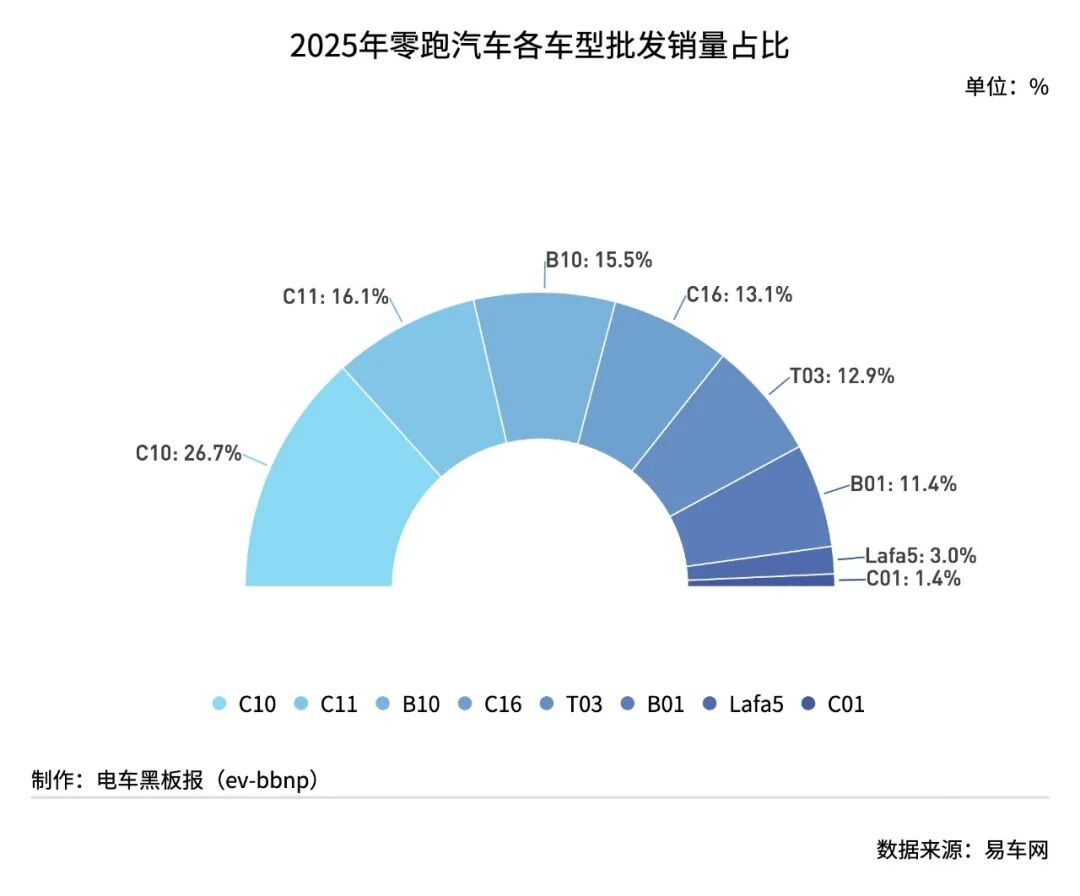 2025年,C10取代C11成为零跑销量最高的车型。结合易车网数据计算,零跑C10全年累计批发销量同比增长112.2%至15.9万辆,占公司总交付量的26.7%。
